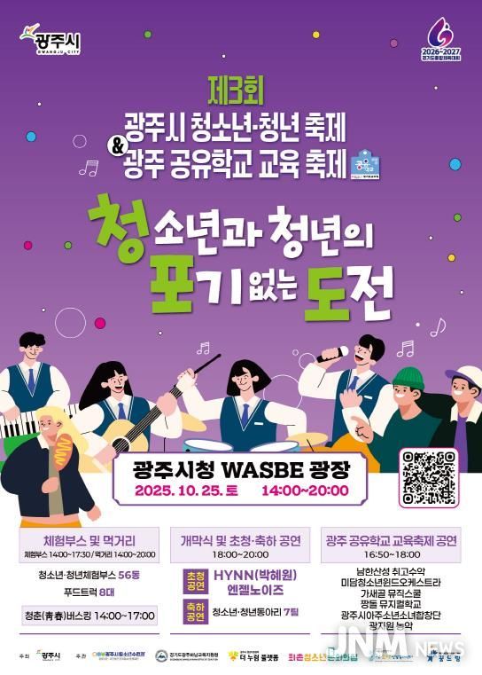 제이앤엠뉴스 | 광주시는 오는 25일 오후 2시부터 8시까지 시청 WASBE 광장에서 ‘제3회 광주시 청소년·청년 축제 청·포·도 · 광주 공유학교 교육 축제’를 개최한다고 14일 밝혔다.