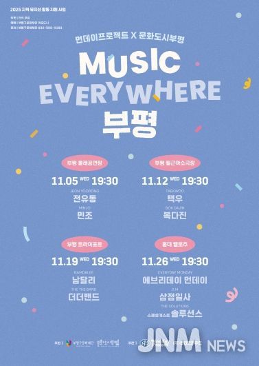 제이앤엠뉴스 | 부평구 문화재단 문화도시센터는 오는 11월 매주 수요일 오후 7시 30분 지역 뮤지션들의 공연 ‘MUSIC EVERYWHERE 부평’을 총 4회에 걸쳐 진행한다고 밝혔다.