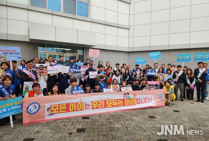 제이앤엠뉴스 | 서산교육지원청은 14일 성연중학교 통학로에서 등굣길 학교폭력 예방 캠페인을 전개했다.