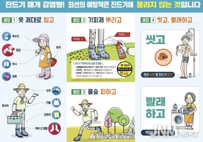 또한 진드기 기피제를 사용하고, 야외활동 후에는 입은 옷을 세탁하고 바로 샤워하는 것이 좋다.