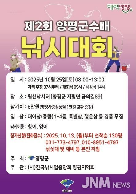 제이앤엠뉴스 | 양평군은 오는 25일 관내 월산낚시터에서 ‘제2회 양평군수배 낚시 대회’를 개최한다고 밝혔다.