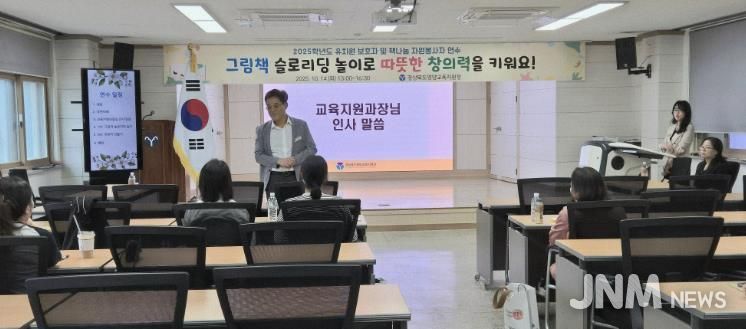 제이앤엠뉴스 | 경상북도영양교육지원청은 2025년 10월 14일 영양교육지원청 대회의실에서 ‘그림책 슬로리딩 놀이로 따뜻한 창의력을 키워요’라는 주제로 관내 유치원, 어린이집 및 초등 1, 2학년 학생과 학부모를 대상으로 2025 유치원·초등 저학년 보호자 및 책나눔 자원봉사자 연수를 개최했다.