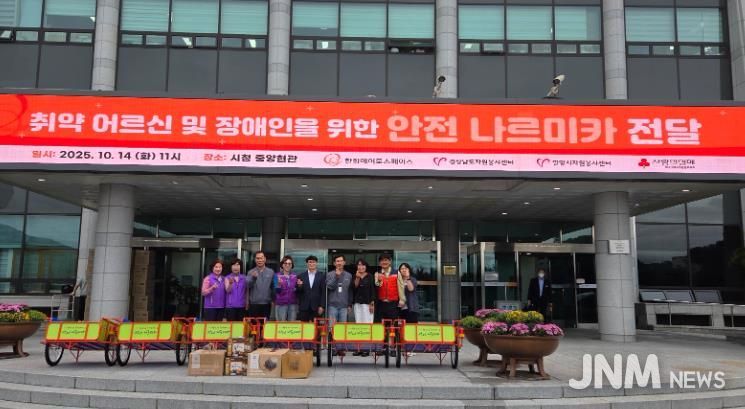 제이앤엠뉴스 | 밀양시자원봉사센터는 14일, 한화에어로스페이스 2사업장과 경상남도자원봉사센터가 함께 생계형 폐자원 수집 취약계층의 안전한 근로환경 조성을 위한 ‘안전나르미카’ 6대를 밀양시에 기탁했다고 밝혔다.