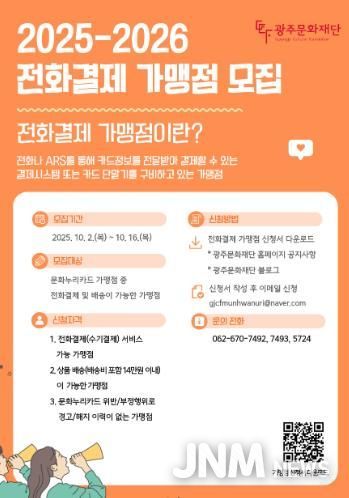 제이앤엠뉴스 | 광주문화재단은 문화누리카드 이용이 어려운 시민들을 위해 전화 한 통으로 문화생활을 즐길 수 있는 전화결제 가맹점을 오는 10월 16일까지 모집한다.