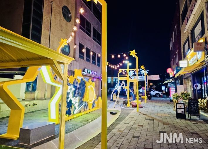 제이앤엠뉴스 | 문경시는 점촌원도심상권 130m 구간에 노란색 간판과 어닝을 새로 달고, 상징 조형물 13점, 조형벤치 20개를 설치했으며, 은하수 조명 18m와 360여 개의 파티등으로 ‘닻별 테마길’을 화려하게 완공했다.