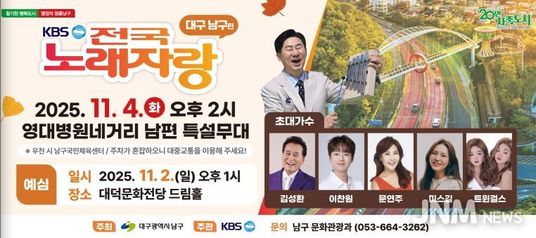 제이앤엠뉴스 | 대구 남구는 국내 최장수 인기 프로그램인 KBS 전국 노래자랑 ‘대구 남구편’이 오는 11월 4일 오후 2시, 영대병원네거리 남편 특설무대에서 열린다고 밝혔다.