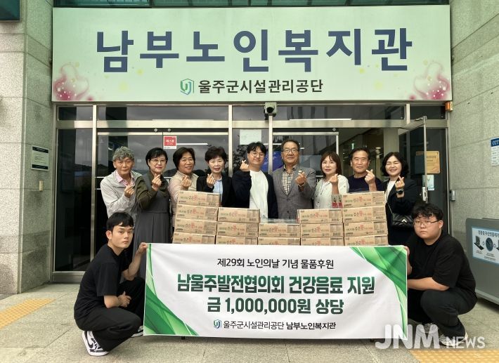 제이앤엠뉴스 | 울주군시설관리공단 남부노인복지관(관장 조덕행)은 10월 14일 남울주발전협의회(회장 한성율)로부터 100만원 상당의 건강음료 1,000개를 기부받았다.