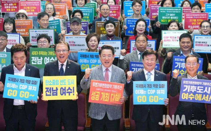 제이앤엠뉴스 | 전라남도는 14일 여수 진남문예회관에서 ‘2026년 유엔기후변화협약 기후주간’ 국내 개최지 공모에 여수가 선정된 것을 축하하고, 행사 성공개최를 다짐하는 기념행사를 열었다.