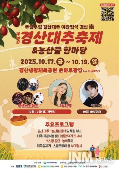 제이앤엠뉴스 | (재)경산문화관광재단은 ‘제14회 경산대추축제 & 농산물 한마당’을 오는 17일부터 19일까지 3일간 경산생활체육공원 온마루광장(구 어귀마당)에서 개최한다.