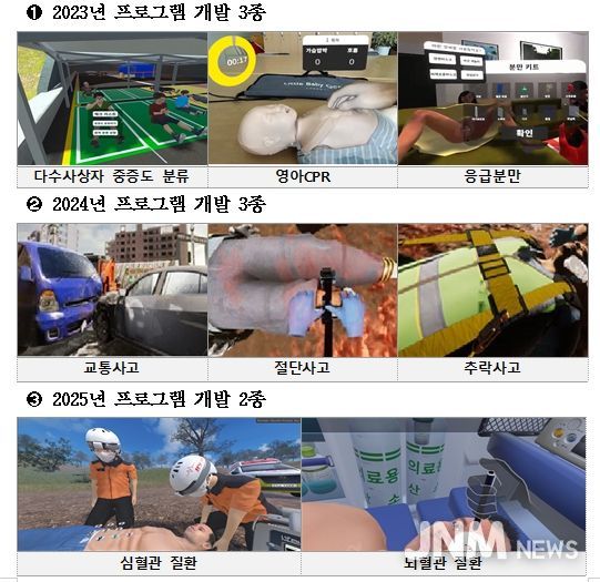 2023년에는 다수사상자 중증도 분류, 영아 심폐소생술, 응급분만, 2024년에는 중증외상(교통사고, 절단사고, 추락환자) 프로그램을 개발했고, 올해는 심·뇌혈관 질환 대응 VR 프로그램을 추가로 구축하여 응급환자 대응 전 과정을 가상 환경에서 종합 훈련할 수 있는 AI-VR 융합 의료 교육 체계를 완성했다.