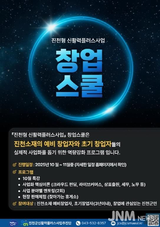 제이앤엠뉴스 | 충북 진천군 신활력플러스사업 추진단은 오는 11월까지 약 2개월간 지역 창업 역량을 높이고, 창업 꿈을 현실로 만드는 ‘진천형 신활력플러스사업 창업스쿨’을 본격 운영한다고 15일 밝혔다.