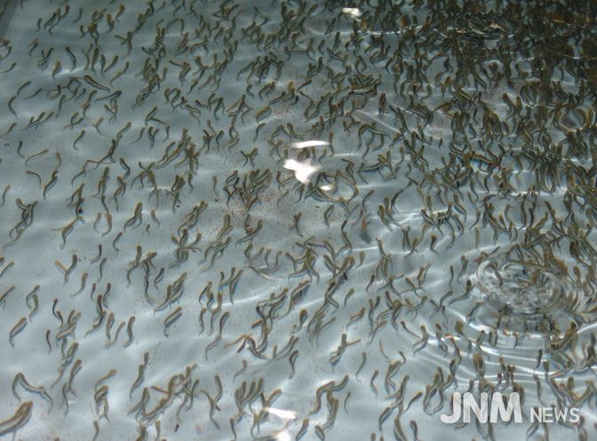포획은 전문 어업인으로 구성된 인력 13명이 투입되어 오십천에 설치된 포획장에서 진행된다.