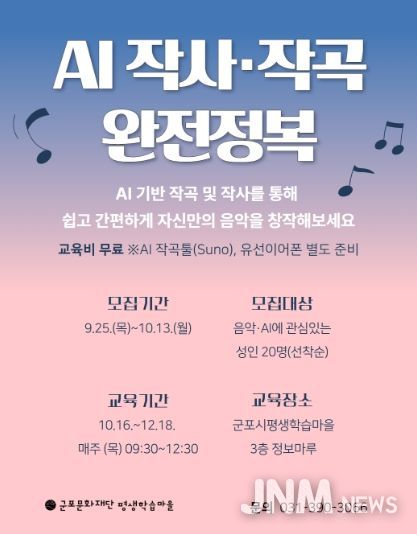 제이앤엠뉴스 | 군포시평생학습마을이 4차 산업혁명 시대의 핵심 기술인 인공지능(AI)을 활용한 예술 창작교육을 선보인다. 오는 10월 16일부터 12월 18일까지 매주 목요일 진행되는 'AI 작사·작곡 완전정복' 강좌는 시민이 디지털 기술을 활용해 직접 노래를 만들고, 음악을 통해 창의력을 확장할 수 있도록 기획됐다.