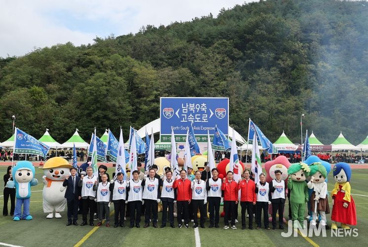 행사는 ‘남북9축, 함께 잇다’ 슬로건 아래 강원·경북 10개 시‧군 대표단이 운동장 양 끝에서 동시에 출발, 중앙에 위치한 제막무대에서 하나로 모여 ‘남북9축 고속도로’ 표지판을 공동 제막하는 순으로 진행됐다.