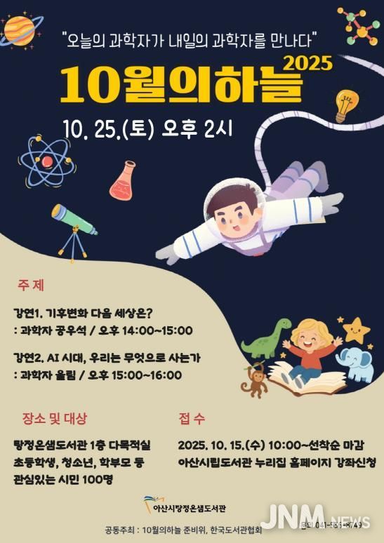 제이앤엠뉴스 | 아산시는 오는 25일, 탕정온샘도서관과 꿈샘어린이청소년도서관에서 ‘10월의 하늘’ 과학 강연을 개최한다고 밝혔다.