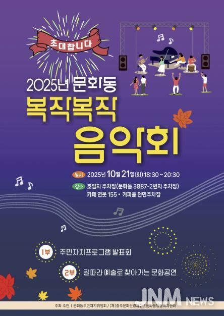 문화동행정복지센터은 ‘2025년 문화동 복작복작 음악회’를 오는 21일 저녁 6시 30분에 호암지 주차장(문화동 3887-2번지)에서 개최한다고 밝혔다.