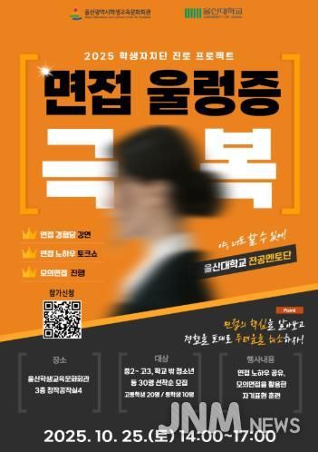 제이앤엠뉴스 | 울산학생교육문화회관은 오는 25일 본관 학생자치실에서 중2~고3, 학교 밖 청소년 등 30명을 대상으로 ‘면접 울렁증 극복 프로그램’을 진행한다.