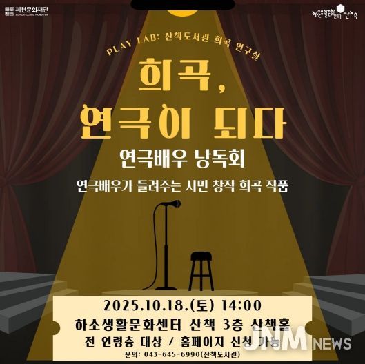 제이앤엠뉴스 | 제천문화재단(이사장 김상수)이'2025년 문학상주작가 지원사업'의 일환으로 상주작가와 마지막 문학프로그램인 '희곡, 연극이 되다' 연극배우 낭독회를 오는 18일 하소생활문화센터 산책에서 선보인다.