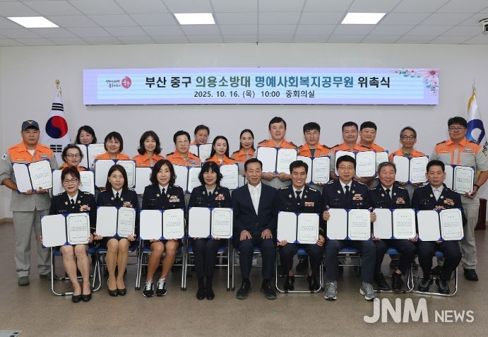 제이앤엠뉴스 | 부산 중구는 지난 16일 중부소방서 의용소방대원 54명을 중구 명예사회복지공무원으로 위촉하는 행사를 개최했고, 중부소방서 의용소방대 본대 이봉석 남성대장, 심경란 여성대장등이 참석했다.