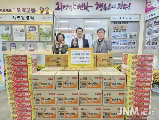 제이앤엠뉴스 | 광주시 양벌동 e편한세상 아파트 입주민들은 지난 16일 광주시 오포2동을 방문해 어려운 이웃을 돕기 위한 라면(160만 원 상당)을 기탁했다.