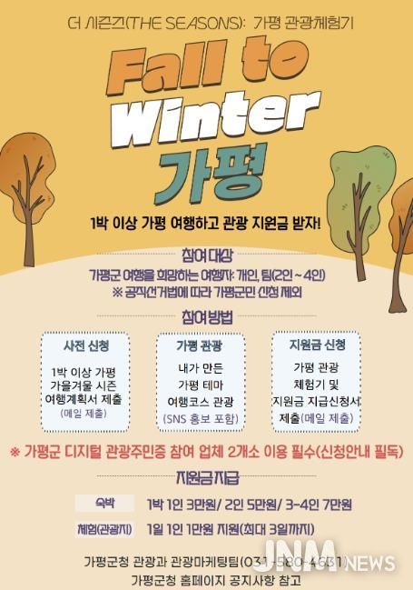 제이앤엠뉴스 | 가평군은 가을과 겨울철 지역관광 활성화를 위해 체류형 관광객에게 숙박비와 체험비를 지원하는 ‘더 시즌즈(The Seasons) 행사를 추진한다고 17일 밝혔다.