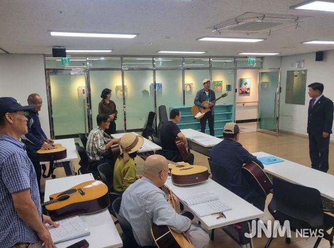 제이앤엠뉴스 | 고성군이 운영하는 고성군종합사회복지관 분관에서는 10월 17일 저녁, 야간노래교실과 통기타반 수강생들을 격려하기 위해 이상근 군수가 직접 현장을 방문했다.