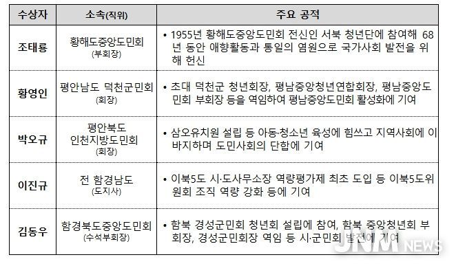 한편, 이번 대회에서는 올해 ‘국가사회발전 이북도민 유공’ 정부포상자로 선정된 39명 중 5명의 유공도민에게 국민훈장 동백장이 수여된다.