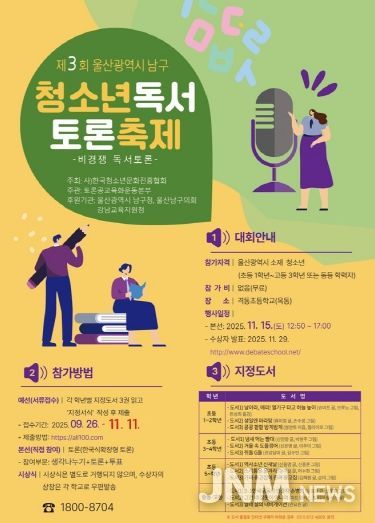 제이앤엠뉴스 | 울산 남구는 청소년의 독서습관 형성과 건전한 토론문화 확산을 위해 오는 11월 15일 격동초등학교에서 개최하는‘2025년 제3회 울산광역시 남구 청소년 독서 토론축제’참가자를 모집한다고 밝혔다.