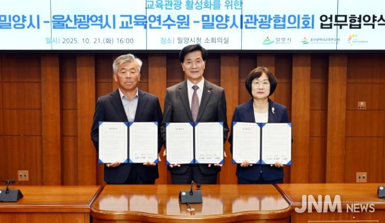 제이앤엠뉴스 | 울산교육연수원은 21일 밀양시청 소회의실에서 경남 밀양시, 밀양시관광협의회와 지역 자원을 활용한 현장 체험 연수 지원 등을 내용으로 하는 업무협약을 체결했다.