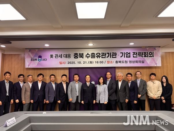 제이앤엠뉴스 | 충북도는 10월 21일 오후 4시 도청 영상회의실에서 KOTRA 충북지원본부, 한국무역보험 충북지역본부 등 9개 수출유관기관*과 충북연구원, 미국 수출기업 3개사**와 美 관세 대응 충북 통상 TF팀 2차 회의로 열린 ‘충북 수출유관기관․기업 전략회의’를 개최했다.