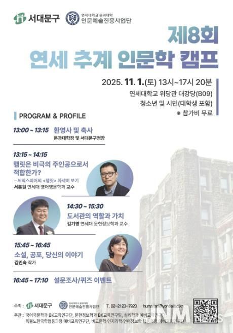 제이앤엠뉴스 | 서대문구가 연세대학교 문과대학과 공동으로 11월 1일 오후 1시부터 5시 20분까지 연세대 위당관 대강당(B09호)에서 ‘제8회 연세 인문학 캠프’를 개최한다. 이 행사는 2023년 1월 시작돼 이번에 8회를 맞았다.