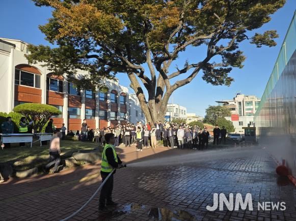 제이앤엠뉴스 | 남해군은 지난 28일 군청 광장에서'화재의 예방 및 안전관리에 관한 법률'에 따라 남해소방서와 합동으로 공공기관 소방훈련을 실시했다.