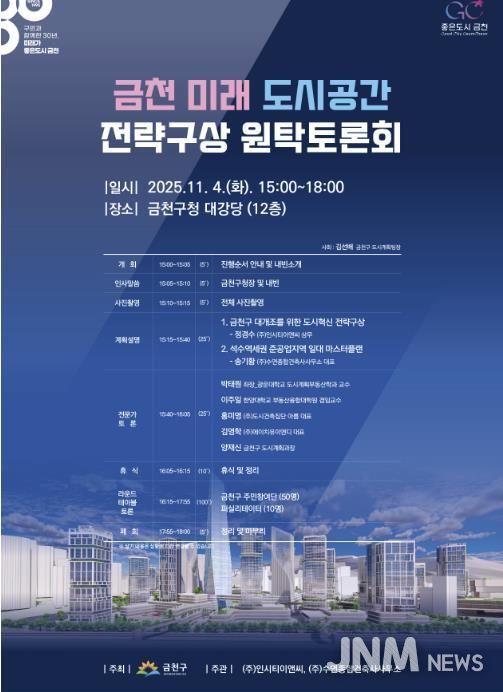 제이앤엠뉴스 | 금천구는 4일 오후 3시 금천구청사 12층 대강당에서 ‘금천의 미래 도시공간 전략구상 계획 수립을 위한 원탁토론회’를 연다고 밝혔다.