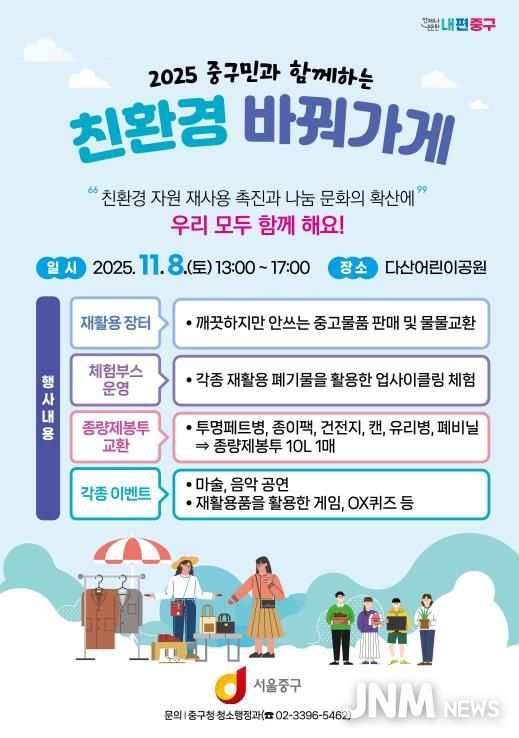 제이앤엠뉴스 | 서울 중구는 오는 11월 8일 오후 1시부터 5시까지, 다산어린이공원에서 ‘2025년 중구민과 함께하는 친환경 바꿔가게’ 행사를 개최한다.