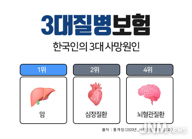 제이앤엠뉴스 | 흔히 3대질병이라 일컫는 암, 심혈관질환, 뇌혈관질환은 통계청 발표자료에 따르면 한국인의 주요 사망원인 중에서 3위 폐렴을 제외하고 1~4위를 차지하고 있으며, 이전부터 지금까지도 살면서 가장 먼저 대비해야 하는 치명적인 질병으로 강조되고 있다. 이러한 중대질병에 대비하기 위하여 상기 세가지 치명적인 질병을 집중보장하는 3대질병진단비보험을 많이 가입하고 있다. 3대진단비보험은 각각의 질병을 중점적으로 보장하면서도 가입자 특성에 맞는 특약을 추가함으로써 종합건강보험으로도 활용할 수가 있다.