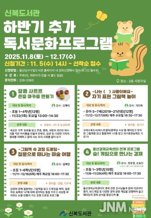제이앤엠뉴스 | 울산 남구 신복도서관은 11월을 맞아 지역 주민들에게 더욱 다양한 독서문화활동과 평생교육의 기회를 제공하기 위해 ‘하반기 추가 독서문화프로그램’을 운영한다고 밝혔다.