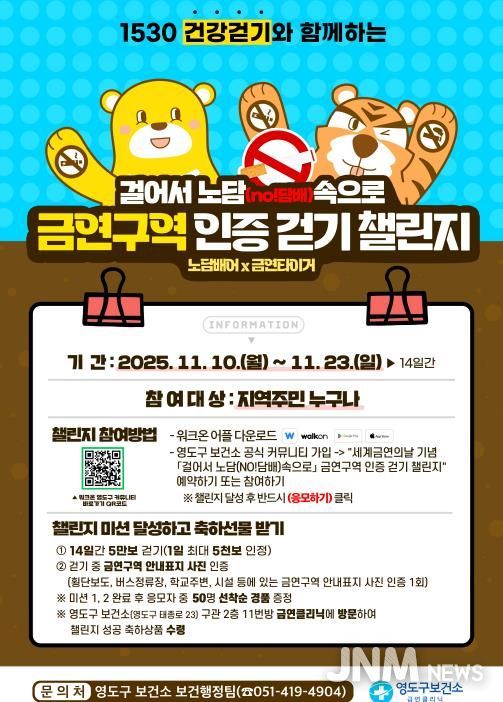 제이앤엠뉴스 | 영도구보건소는 오는 11월 10일부터 11월 23일까지(14일간) 금연 실천 분위기를 확산하고 건강한 지역 환경을 조성하기 위해 ‘제2차 걸어서 노담(No!담배) 속으로’ 금연구역 인증 걷기 챌린지를 운영한다.