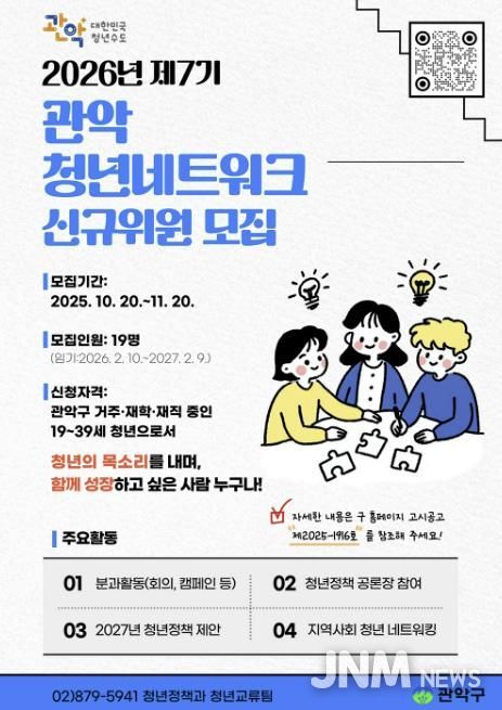 제이앤엠뉴스 | 청년친화도시 관악구가 청년들이 직접 청년을 위한 정책을 발굴하고 제안하는 '제7기 관악청년네트워크' 위원 19명을 신규 모집한다.