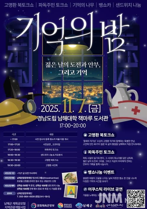 제이앤엠뉴스 | ‘젊은 날의 도전과 안부, 그리고 기억’이라는 주제로 독일마을 기억의 밤 행사가 오는 11월 7일 17시부터 경남도립남해대학 책마루도서관에서 열린다.