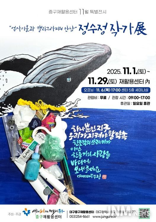 제이앤엠뉴스 | 대구 중구는 11월 1일부터 11월 29일까지 중구재활용센터에서 ‘업사이클과 캘리그라피의 만남’을 주제로 한 정수정 작가 초대전을 개최한다.