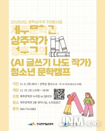 제이앤엠뉴스 | 제주문학관이 한국문화예술위원회 '2025년 문학상주작가 지원사업'의 일환으로 상주작가 정훈교의 '인공지능(AI) 글쓰기 나도 작가' 청소년 문학캠프를 개최한다.