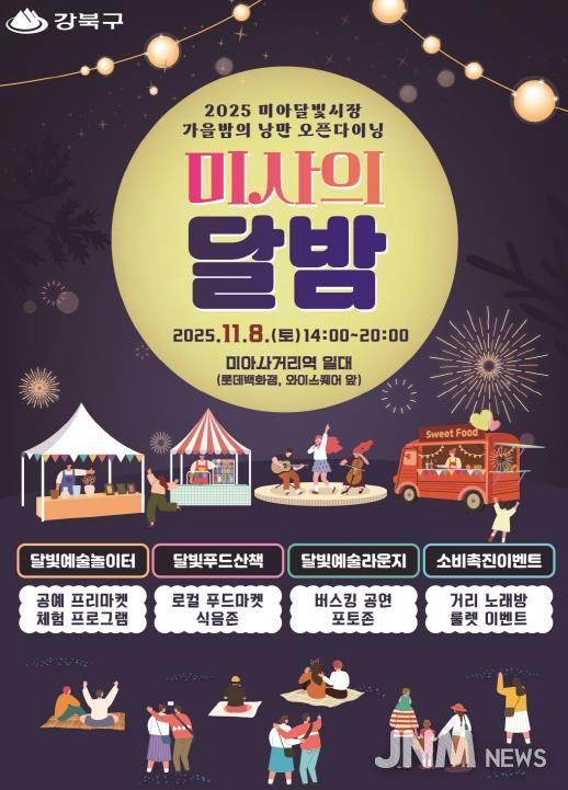제이앤엠뉴스 | 서울 강북구는 11월 8일 오후 2시부터 8시까지 미아사거리역 일대(롯데백화점, 와이스퀘어 앞)에서 '2025 미아달빛시장 가을밤의 낭만 오픈다이닝 '미사의 달밤''을 개최한다.