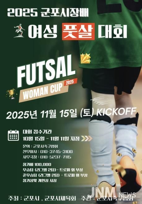 제이앤엠뉴스 | 군포시는 여성 생활체육 참여 확대와 건전한 스포츠 문화 확산을 위해 ‘2025 군포시장배 여성 풋살대회’를 오는 11월 15일(토) 군포시 국민체육센터 축구장에서 개최한다.