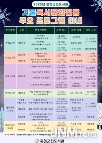 제이앤엠뉴스 | 홍천군립도서관은 겨울철 독서 의욕 고취와 도서관 이용 활성화를 위해 11월 21일부터 12월 24일까지 연봉도서관, 서석도서관, 남면도서관, 내면도서관, 별빛나루도서관, 홍천어린이도서관 등 6개 도서관에서 ‘겨울과 크리스마스’를 주제로 한 독서문화진흥 프로그램을 운영한다.