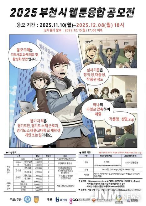 제이앤엠뉴스 | 부천시는 11월 10일부터 12월 8일까지 서울신학대학교 ‘이룸(eRoom)’ 플랫폼을 통해 지역 웹툰 창작 생태계를 조성하고 차세대 창의인재를 발굴하기 위한 ‘2025 부천시 웹툰융합공모전’을 개최한다.