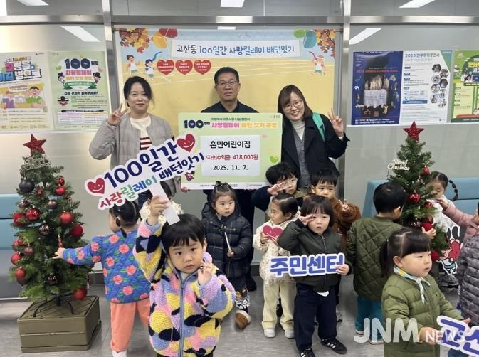제이앤엠뉴스 | 의정부시 고산동주민센터는 11월 7일 훈민어린이집이 바자회를 통해 모은 수익금 40여만 원을 기탁하며 ‘100일간 사랑릴레이 배턴 잇기’에 동참했다고 밝혔다.
