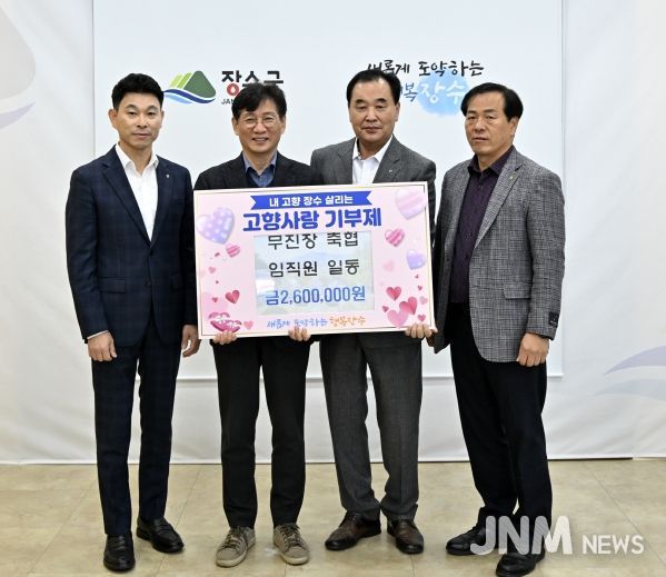 제이앤엠뉴스 | 무진장축산업협동조합(조합장 송제근) 임직원들이 재작년과 작년에 이어 올해에도고향사랑기부제 활성화를 위해 장수군에 고향사랑기부금 240만 원을 기탁했다.