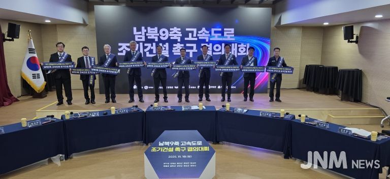 제이앤엠뉴스 | 남북9축고속도로 추진협의회(협의회장:양구군수)는 10일 양구군 평생학습관에서 ‘남북9축고속도로 조기건설 촉구 결의대회’를 개최했다. 이번 행사에는 남북9축고속도로 추진협의회 10개 시·군의 단체장과 부단체장·기획부서장이 참석해 공동결의문을 만장일치로 채택·서명했으며, 제3차 고속도로 건설계획(2026~2030)에 남북9축(양구~영천) 고속도로를 반영할 것을 정부에 공식 요구했다.