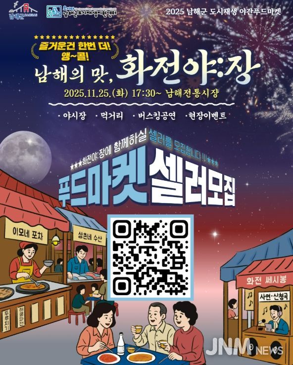 제이앤엠뉴스 | 남해군 도시재생지원센터는 지역 상권 활성화와 야간 관광문화 조성을 위해 ‘2025 남해군 도시재생 야간푸드마켓 화전야:장’에 참여할 셀러를 모집한다.