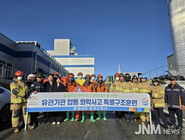 제이앤엠뉴스 | 홍성소방서는 11월 10일 홍성군 광천읍 소재 천일식품에서 화학물질 유출사고를 가정한 유관기관 합동 화학사고 특별구조훈련을 실시했다.